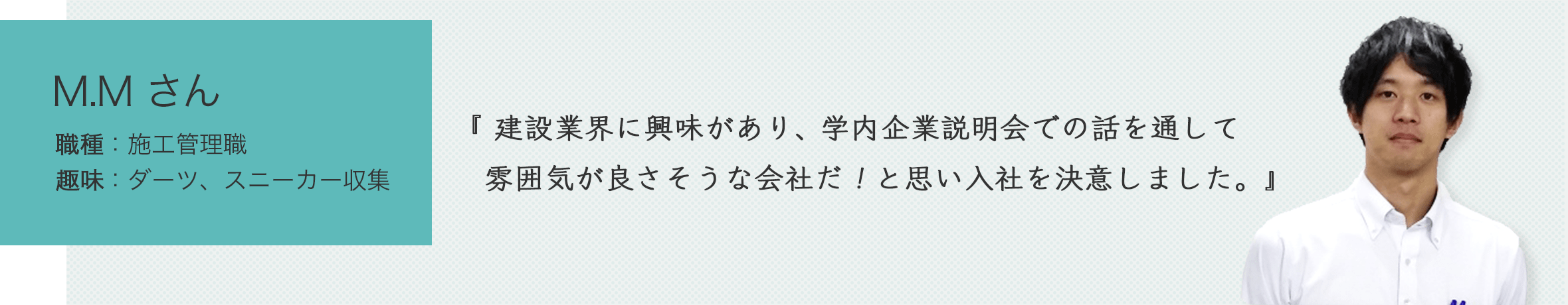 この仕事をしていく中でつらいことや苦しいことが多くあります。しかし、工事が完了した時など、節目を迎えたときには、他の仕事よりも達成感ややりがいを大きく感じる仕事だとも思います。是非、一緒に頑張りましょう。